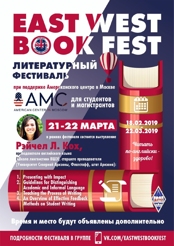 В рамках фестиваля East West Book Fest 21-22 марта будут проводиться лекции и мастер-классы преподавателя английского языка (школа лингвистики ВШЭ), старшего преподавателя (Университета Северной Аризоны, Флагстафф, штат Аризона) Рейчел Л. Кох. Представляем Вам анонс мероприятий спикера.