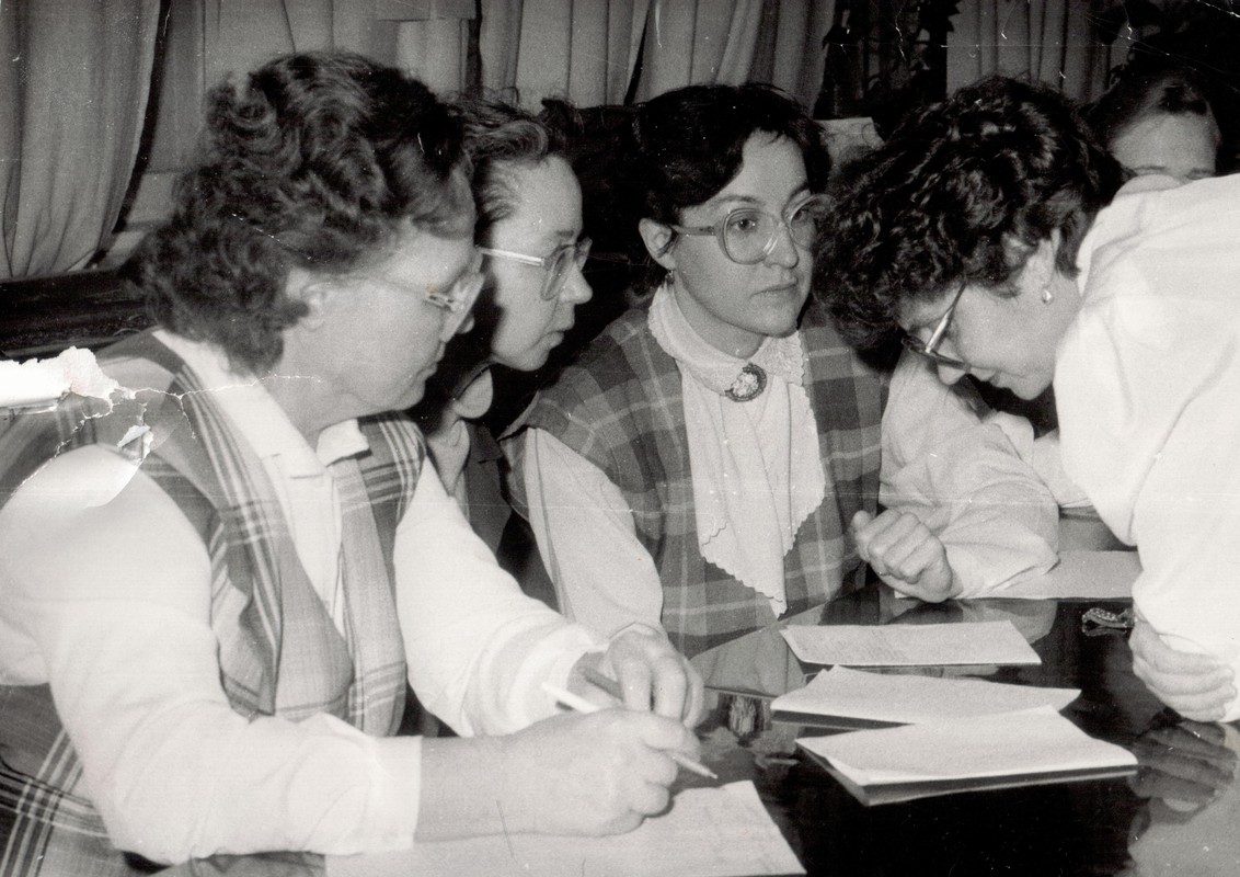 Сотрудники кафедры ИиВТ и лаборатории ВТ МГПИ – 1988 г. 1 ряд сверху: Алферова Т.М., Бодрова Н.Г., Овчинникова И.Г., Сибряева В.П. (зав. лаб. ВТ), Машкина И.В. 2 ряд: Морозова О.В. (секретарь каф.), Зильберберг Н.И., Ипатова Э.Р. (зав. каф.)