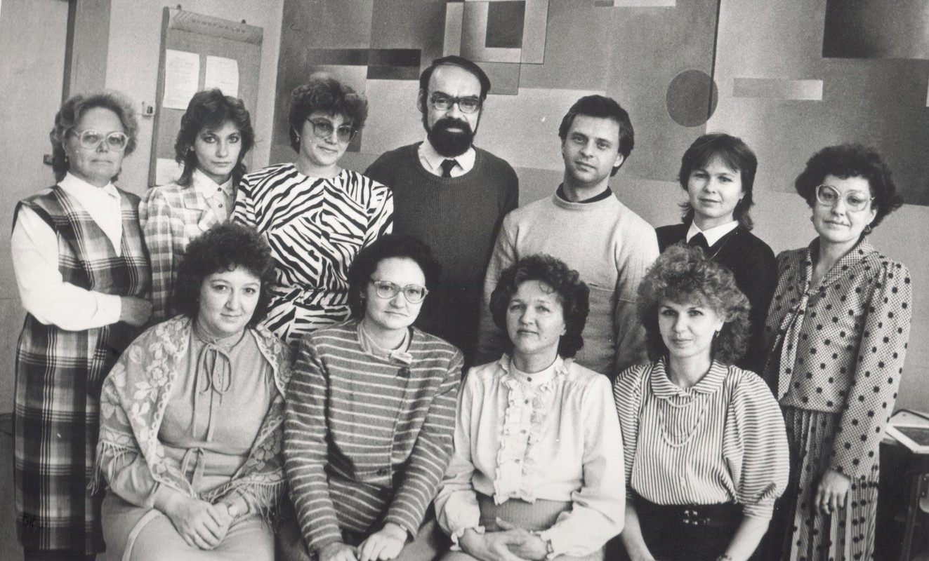 Сотрудники кафедры ИиВТ и лаборатории ВТ МГПИ – 1988 г. 1 ряд сверху: Алферова Т.М., Бодрова Н.Г., Овчинникова И.Г., Сибряева В.П. (зав. лаб. ВТ), Машкина И.В. 2 ряд: Морозова О.В. (секретарь каф.), Зильберберг Н.И., Ипатова Э.Р. (зав. каф.)