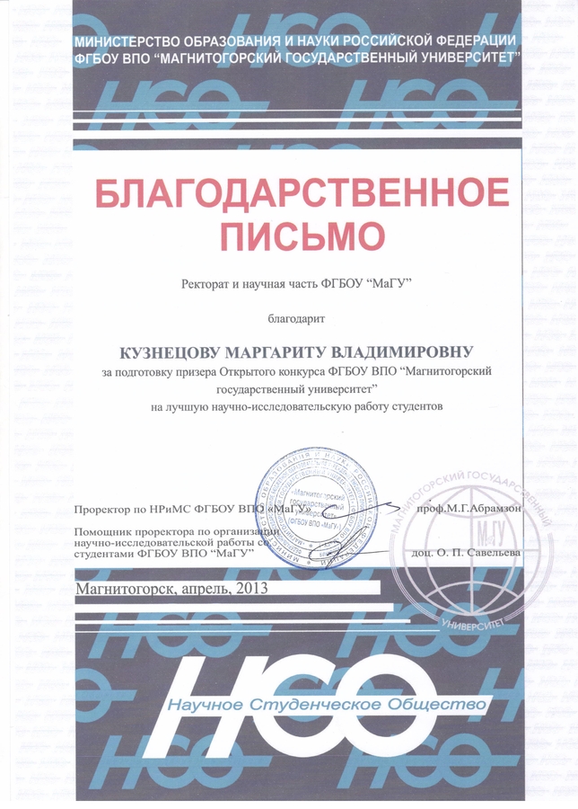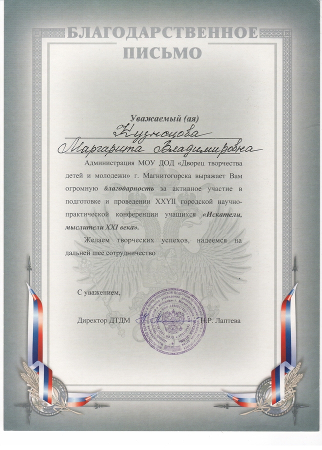 Благодарственное письмо Кузнецовой М.В.