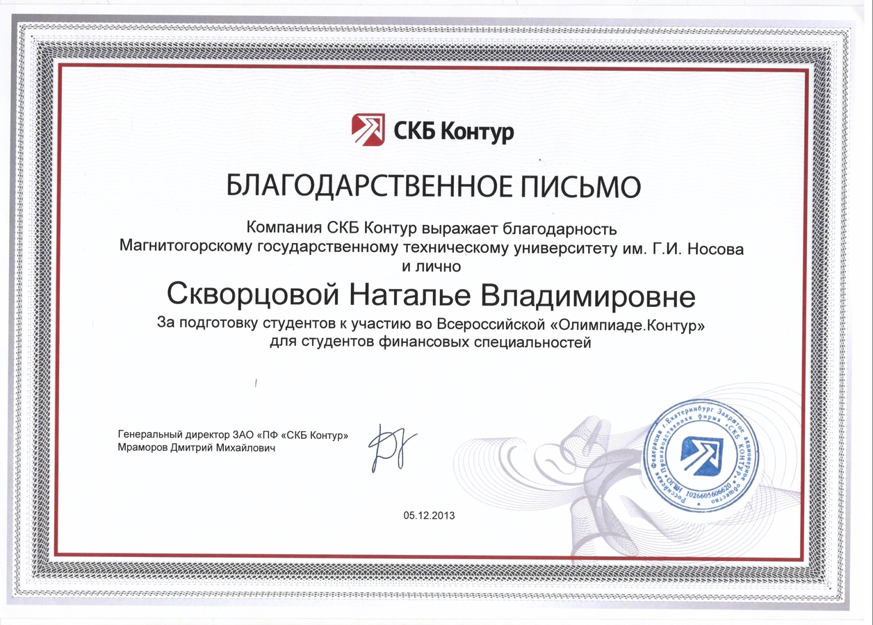 Благодарственное письмо Скворцовой Н.В.