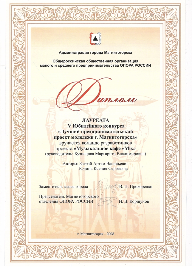 Диплом команды разработчиков проекта «Музыкальное кафе MIX»