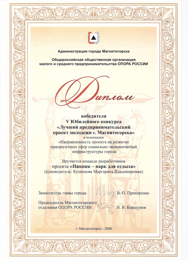 Диплом команды разработчиков проекта «Пикник - парк для отдыха»
