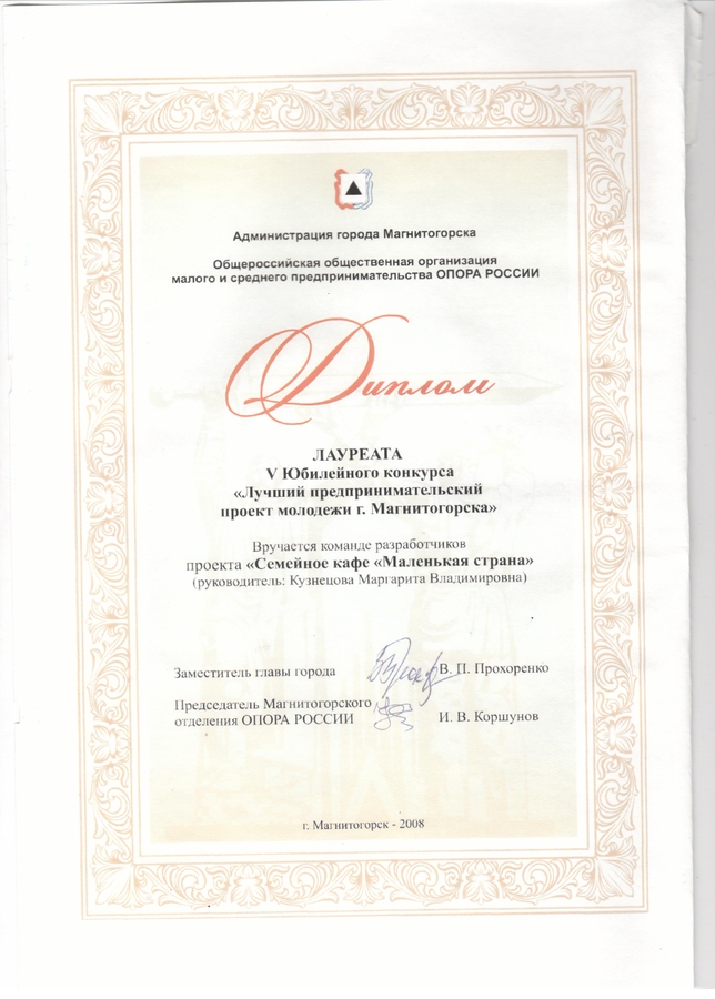 Диплом команды разработчиков проекта «Семейное кафе «Маленькая страна»