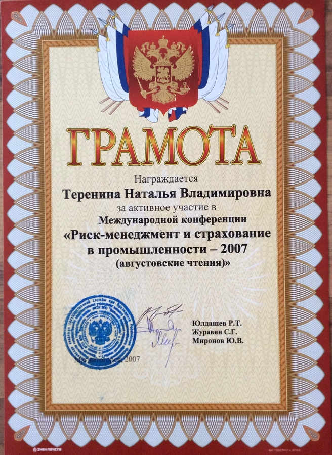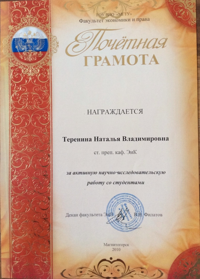 Грамота Терениной Н.В.