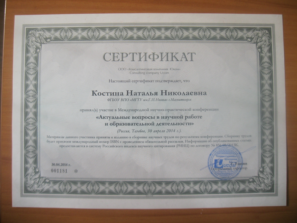 Сертификат Костиной Н.Н.