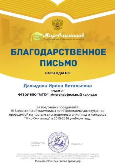 2015-2016 уч.год Свидетельство о подготовке к участию в международной олимпиаде по информатике проекта «Инфоурок» учащихся, занявших 1, 2 и 3 места (2015г.) 1 место: Моделян Ирина (гр.ЗиК-15-1), Арзамасцева Екатерина (СЭК-14-2); 2 место: Пересыпкин Александр (СС-14-2), Бетмерзаев Турпал-Эл (СС-14-2), Перчаткина Анастасия (СС-14-2), Балан Екатерина (СЗи-14-1) 3 место: Мусина Айгуль (СЗи-14-1), Лыткина Анастасия (СЗи-14-1), Баранова Ирина (СЗи-14-1) |