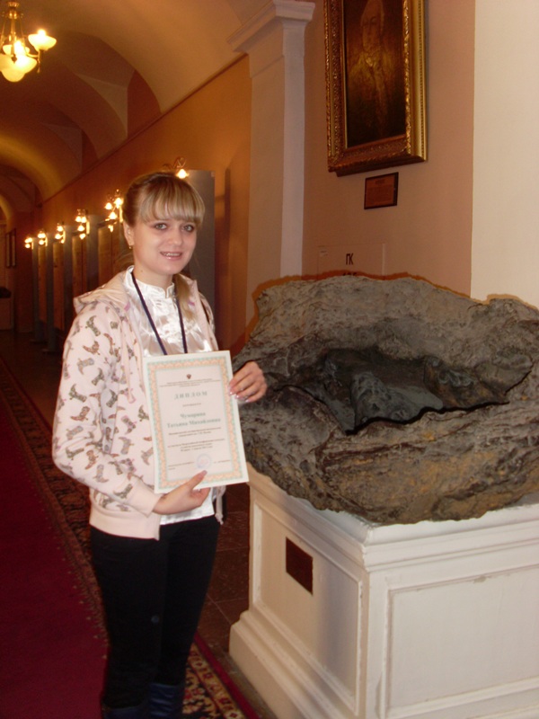 Кроме награды за участие в очном туре конкурса, наша делегация от Многопрофильного колледжа (Е. Щеглова и преподаватель О.С. Матвеева) привезла дипломы победителей заочного тура Всероссийского конкурса. Дипломы получили студентки Рамиля Мажитова, Елена Янсарина за работу «Исследование кислотности атмосферных осадков г. Магнитогорска и прилегающих районов», выполненную под руководством преподавателя О.С. Матвеевой; Карине Петросян и Елена Щеглова за работу «Анализ загрязняющих веществ, выделяемых в атмосферу ОАО «ММК».