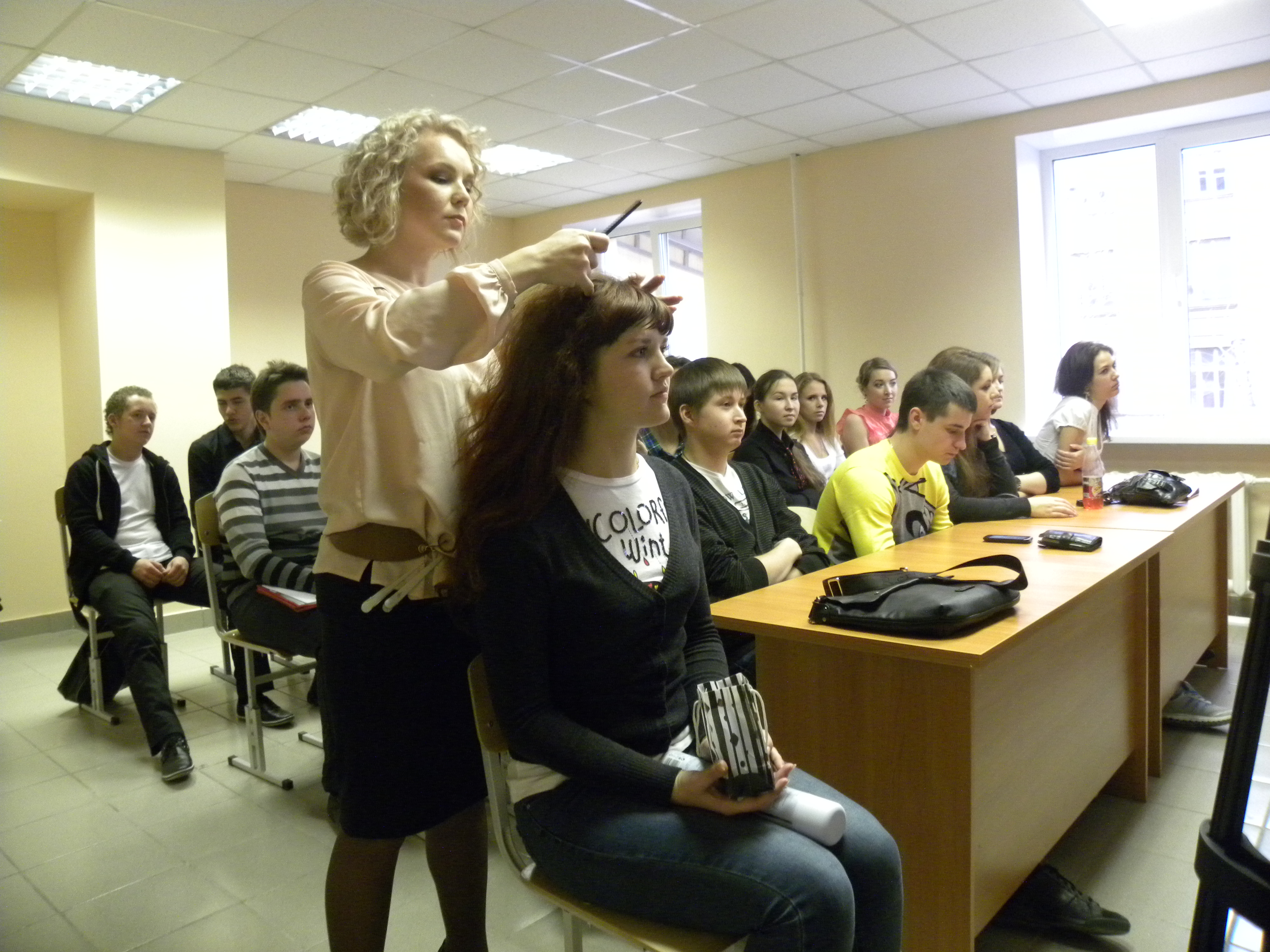 Но что же за деловой имидж без соответствующей прически? Поэтому в аудитории присутствовал стилист в области причесок из салона «Лориэн».