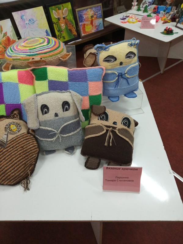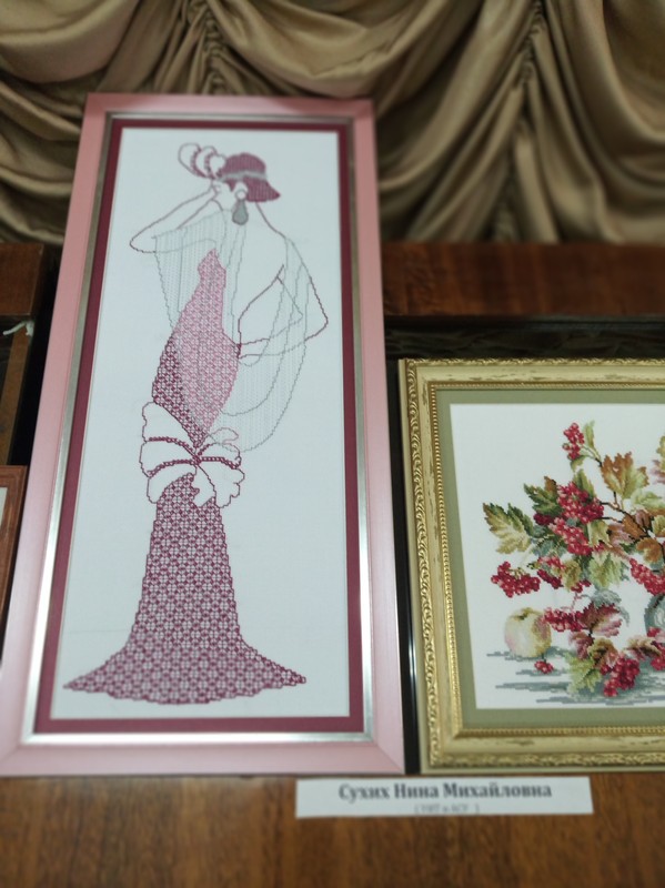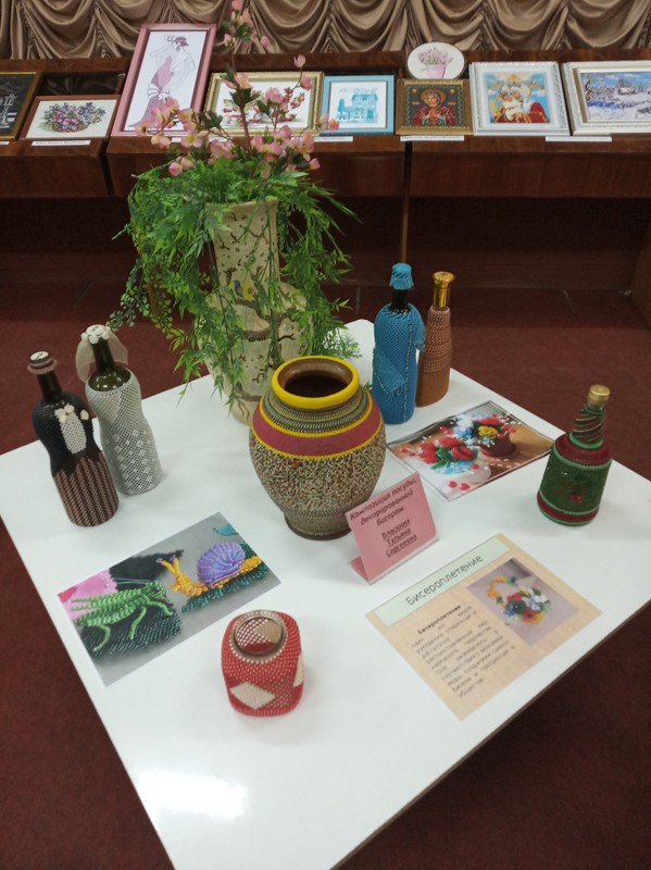 Среди экспонатов поражают своим мастерским исполнением и разнообразием картины, вышитые бисером, посуда, декорированная бисером, выполненные Т.С. Власкиной. Очень интересно оформлены работы в технике декупаж социального педагога МпК Н.В. Алексеевой. Посетителей восхитили рисунки пятилетней Виктории Скиба. Традиционно много зрителей замирают у вышитых картин специалиста УИТиАСУ Н.М. Сухих.