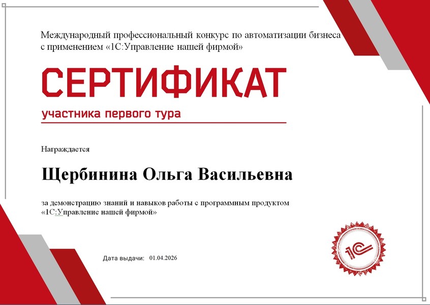 Студенты академической группы АПИб-24-1 направления подготовки 09.03.03 «Прикладная информатика» кафедры БИиИТ ИЭиАС Гужва Семён и Щербинина Ольга стали финалистами Международного профессионального конкурса по автоматизации бизнеса с применением «1С:Управление нашей фирмой».