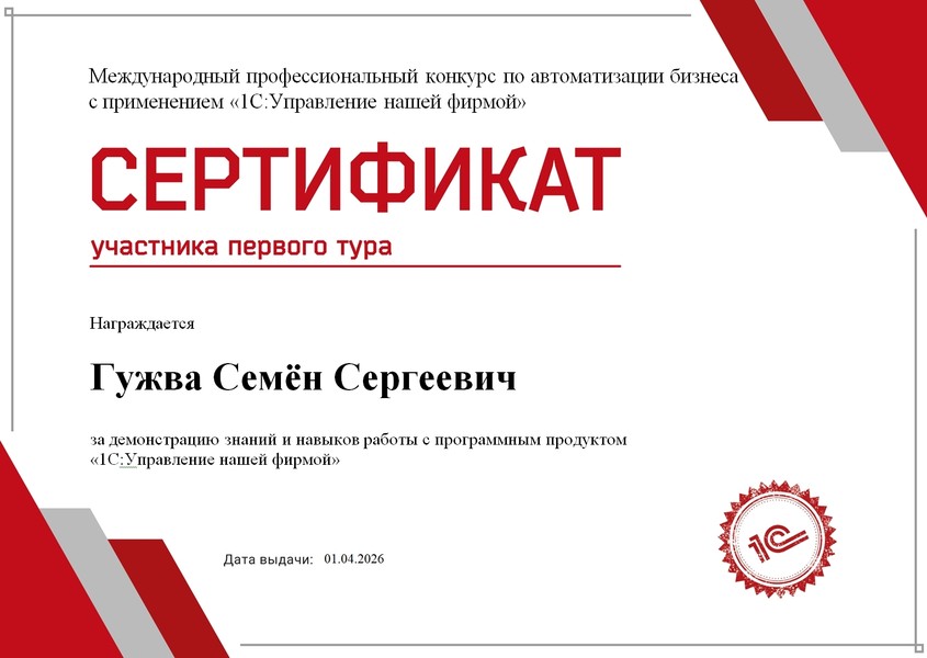 Семён Гужва, Апиб-24-1: «Участие в конкурсе оказалось крайне продуктивным: задания были ориентированы на решение реальных бизнес-задач, что позволило глубже изучить функционал «1С:УНФ». Особенно отмечу практическую ценность конкурсных задач — они способствуют развитию навыков анализа и автоматизации процессов. Попадание в финал считаю важным этапом в освоении автоматизации бизнеса. Данный опыт будет полезен для дальнейшего профессионального роста».